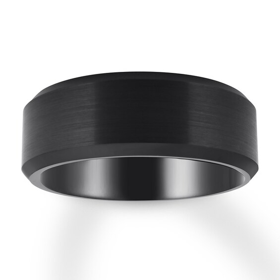 Men's Wedding Band Black Ion-Plated Titanium 8Mm. This titanium men's wedding band is 8 millimeters wide, featuring beveled edges and a segment design. Comfort fit finish on the inside of the ring for more comfortable wear. Tiffany wedding bands are timeless and meticulously handcrafted. Ring is 8mm wide, black plated and has a flat brushed top and grooved polished finish edges. Wedding band in black plated titanium.